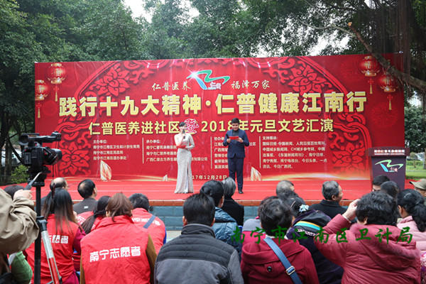 12月28日,由江南区卫生计生局、民政局联合开展“践行十九大·仁普健康江南行”—医养服务进社区暨2018年元旦文艺汇演”,在江南区二桥南社区三元小区广场隆重举行。南宁市卫计委家庭发展科科长周莉、江南区计生协会、街道及居民共500多人参加活动。