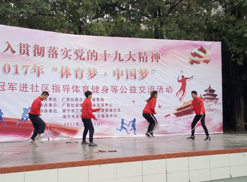 由广西体育局主办、广西社会体育运动发展中心承办、南宁市江南区江南街道新锦社区、南宁市彩虹社会工作服务中心协办的2017年“体育梦·中国梦”——体育冠军进社区公益交流活动,于12月23日上午在新锦社区同心文化广场顺利举行。